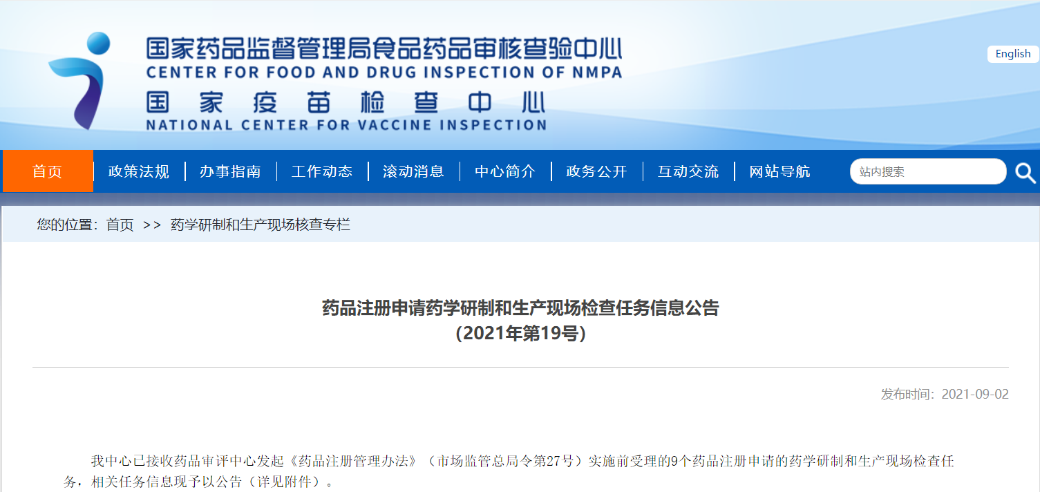 藥品注冊申請藥學(xué)研制和生產(chǎn)現(xiàn)場檢查任務(wù)信息公告(2021年第19號)