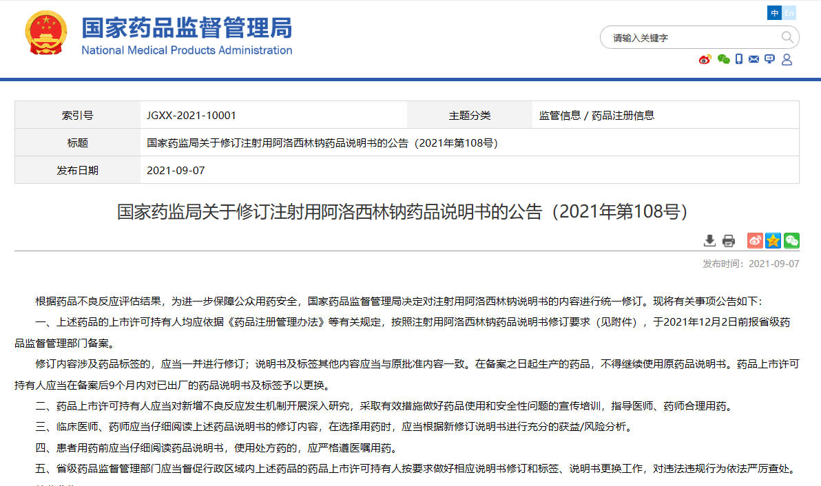 國家藥監(jiān)局關(guān)于修訂注射用阿洛西林鈉藥品說明書的公告(2021年第108號)