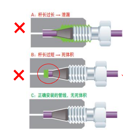 ? 安裝色譜柱時管線伸出接頭長度過短,會在管線前段出現(xiàn)死體積,引起峰形展寬,靈敏度降低。