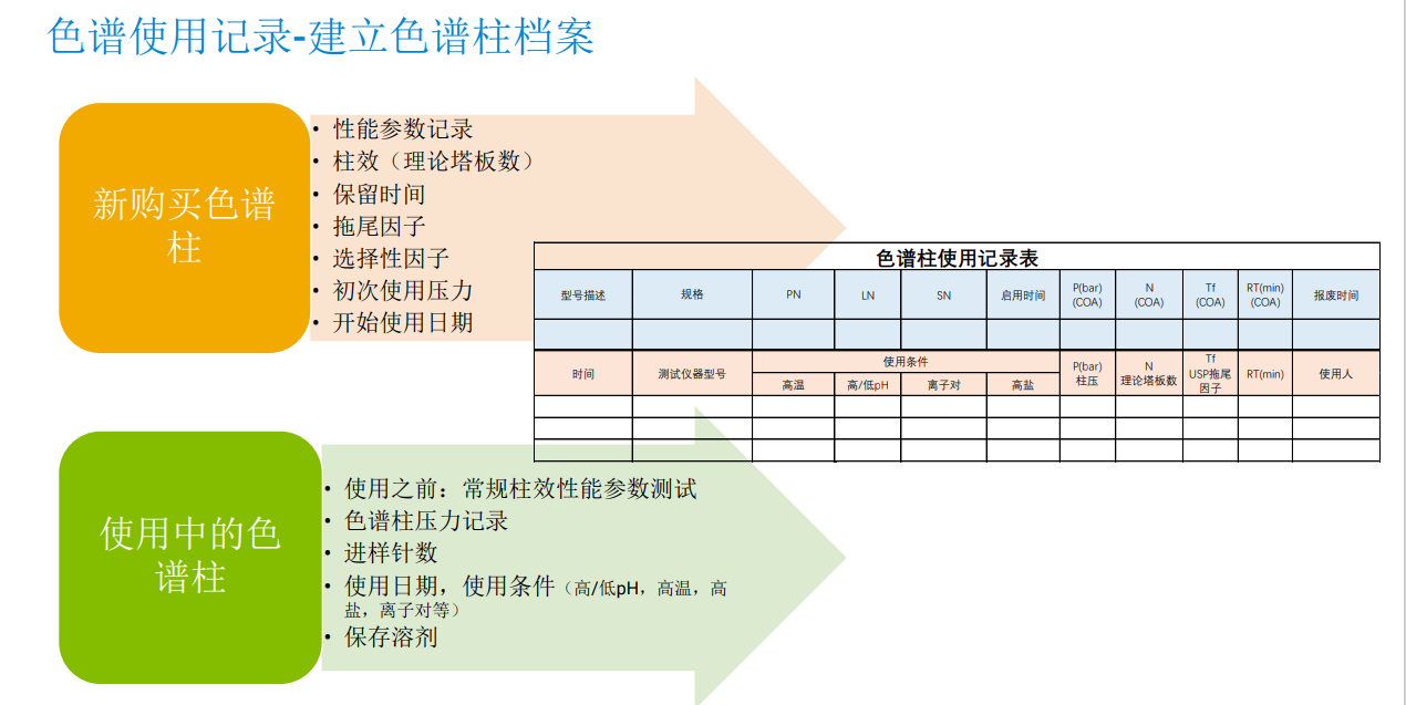 色譜柱是有生命周期的色譜分析關鍵耗材。為了保障色譜柱的正確使用,提高每一根色譜柱的產出,實驗室需要給每根色譜柱建立檔案,對其從購入到每次使用情況進行真實的記錄,保障規(guī)范使用,同時為質量管理體系建設提供原始的資料。