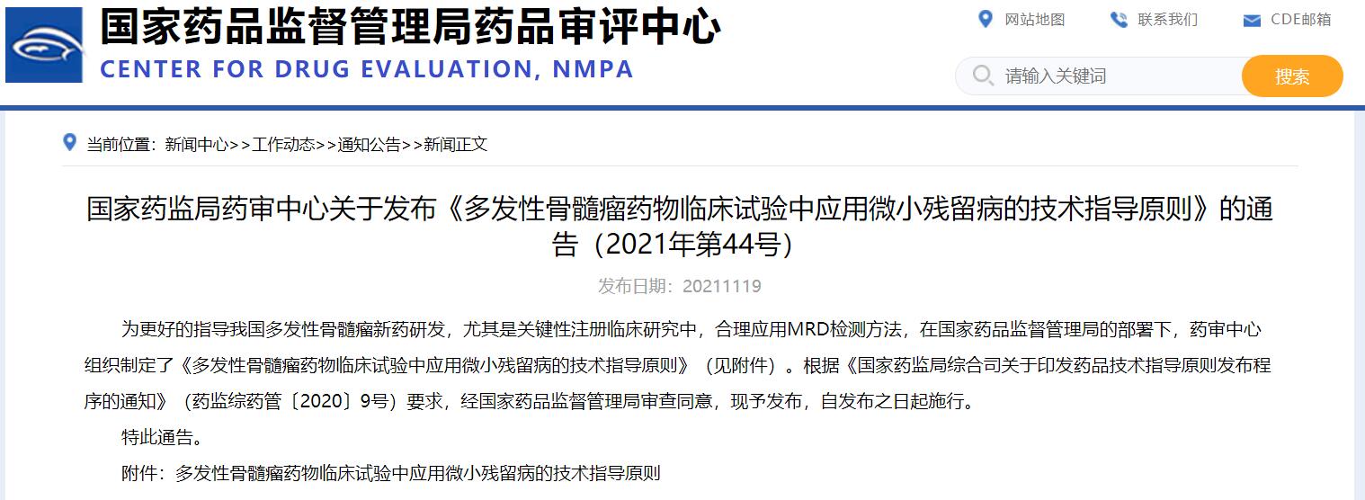 國家藥監(jiān)局藥審中心關(guān)于發(fā)布《多發(fā)性骨髓瘤藥物臨床試驗(yàn)中應(yīng)用微小殘留病的技術(shù)指導(dǎo)原則》的通告(2021年第44號(hào))