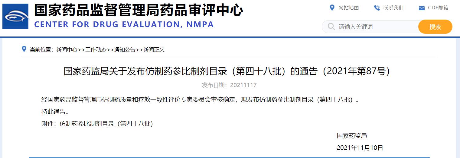 國家藥監(jiān)局關(guān)于發(fā)布仿制藥參比制劑目錄(第四十八批)的通告(2021年第87號(hào))