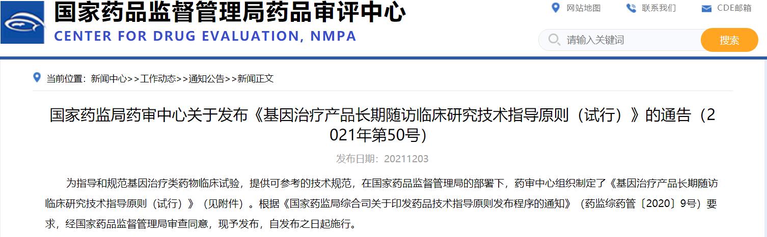 國家藥監(jiān)局藥審中心關于發(fā)布《基因治療產品長期隨訪臨床研究技術指導原則(試行)》的通告(2021年第50號)