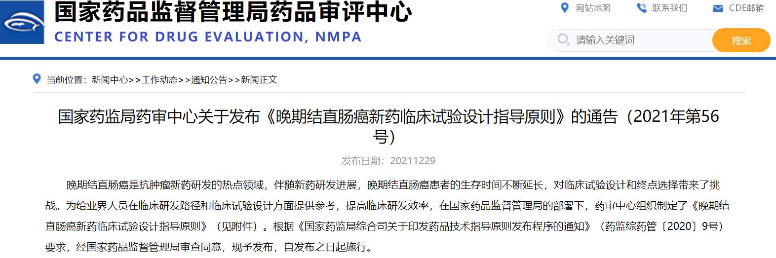 國家藥監(jiān)局藥審中心關于發(fā)布《晚期結直腸癌新藥臨床試驗設計指導原則》的通告(2021年第56號)