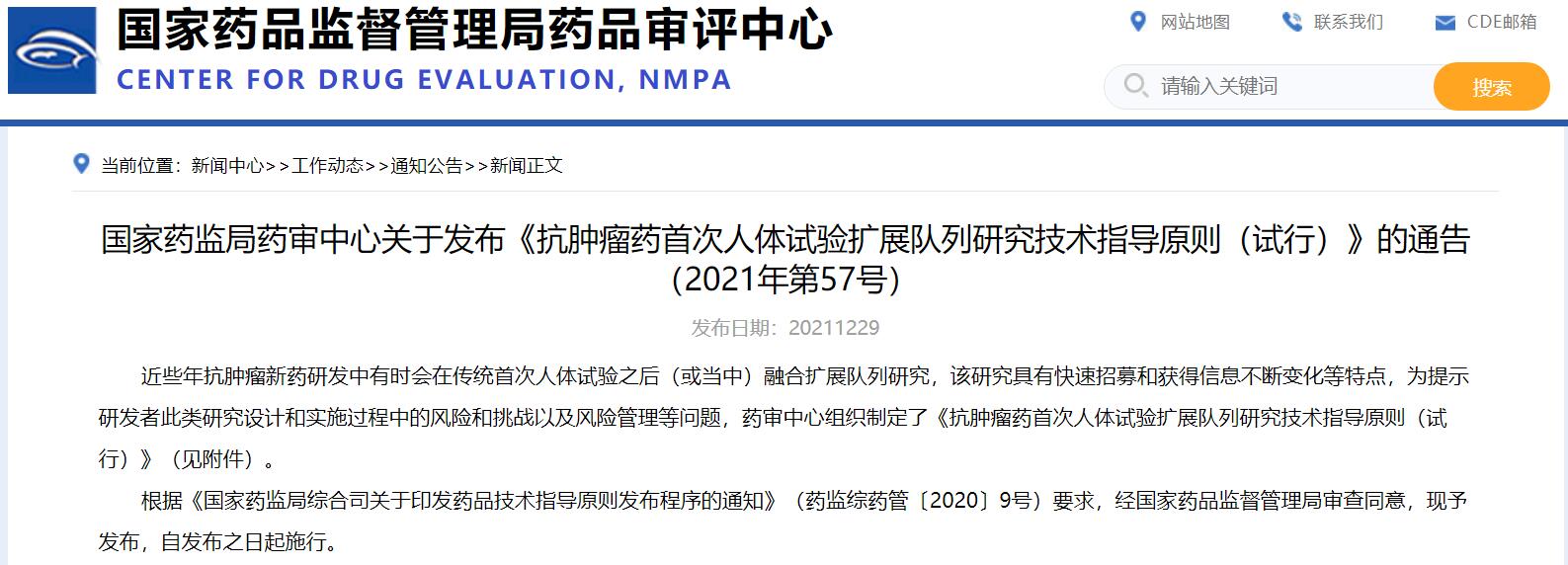 國家藥監(jiān)局藥審中心關于發(fā)布《抗腫瘤藥首次人體試驗擴展隊列研究技術指導原則(試行)》的通告(2021年第57號)