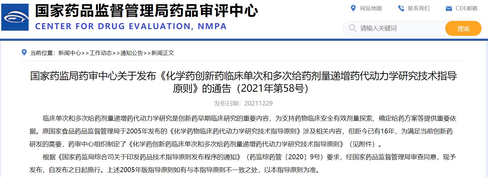 國家藥監(jiān)局藥審中心關于發(fā)布《化學藥創(chuàng)新藥臨床單次和多次給藥劑量遞增藥代動力學研究技術指導原則》的通告(2021年第58號)