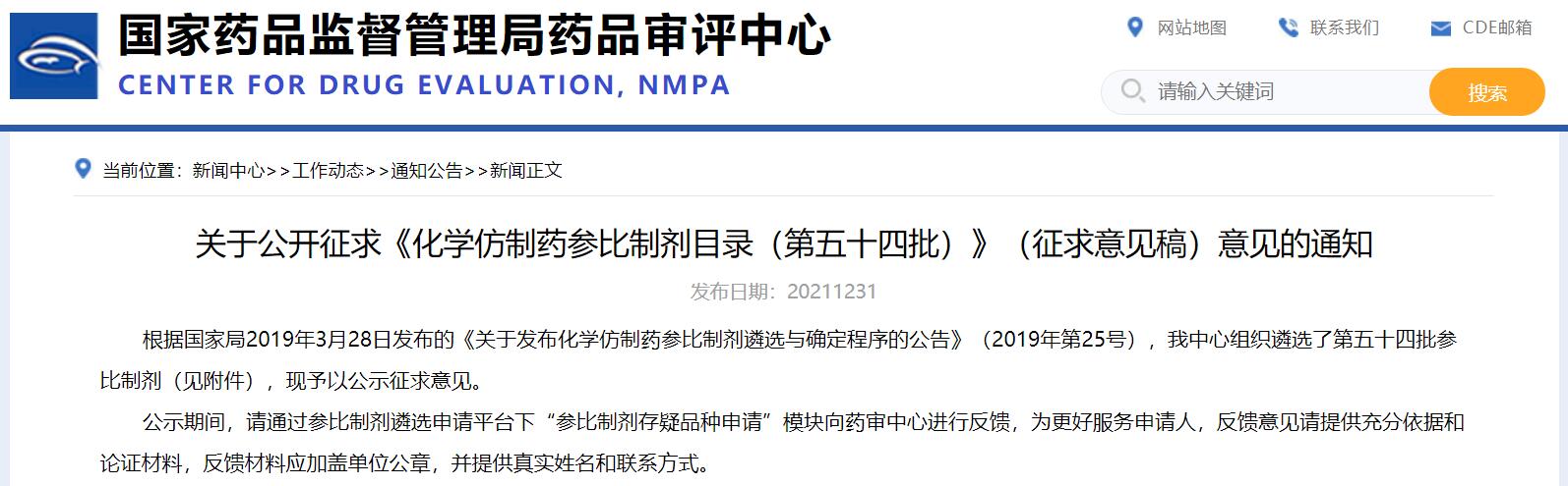 關于公開征求《化學仿制藥參比制劑目錄(第五十四批)》(征求意見稿)意見的通知