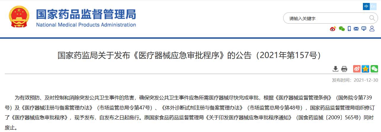 國家藥監(jiān)局關于發(fā)布《醫(yī)療器械應急審批程序》的公告(2021年第157號)