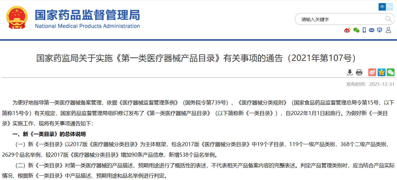 國家藥監(jiān)局關于實施《第一類醫(yī)療器械產品目錄》有關事項的通告(2021年第107號)