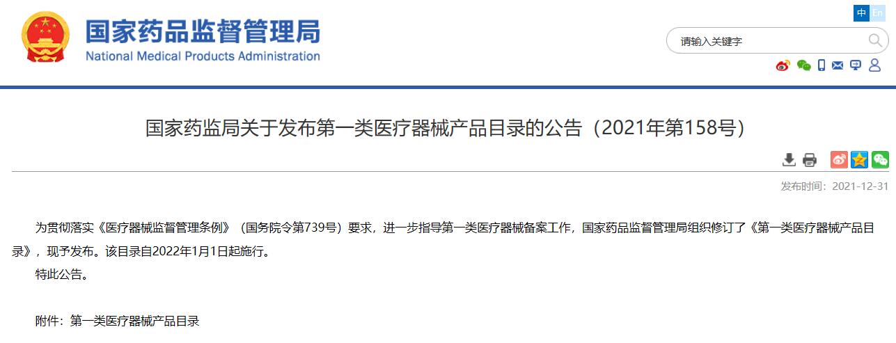 國家藥監(jiān)局關于發(fā)布第一類醫(yī)療器械產品目錄的公告(2021年第158號)