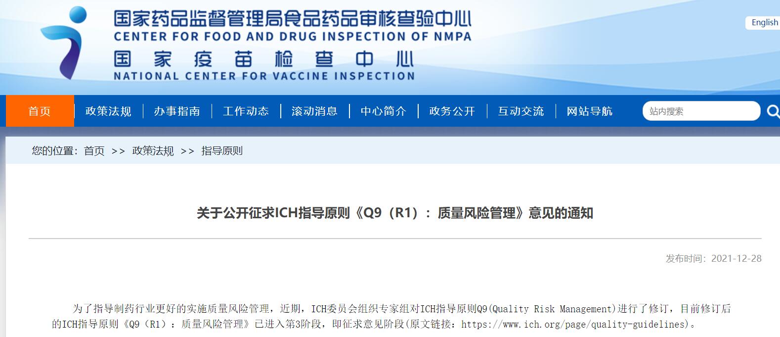 關于公開征求ICH指導原則《Q9(R1):質量風險管理》意見的通知
