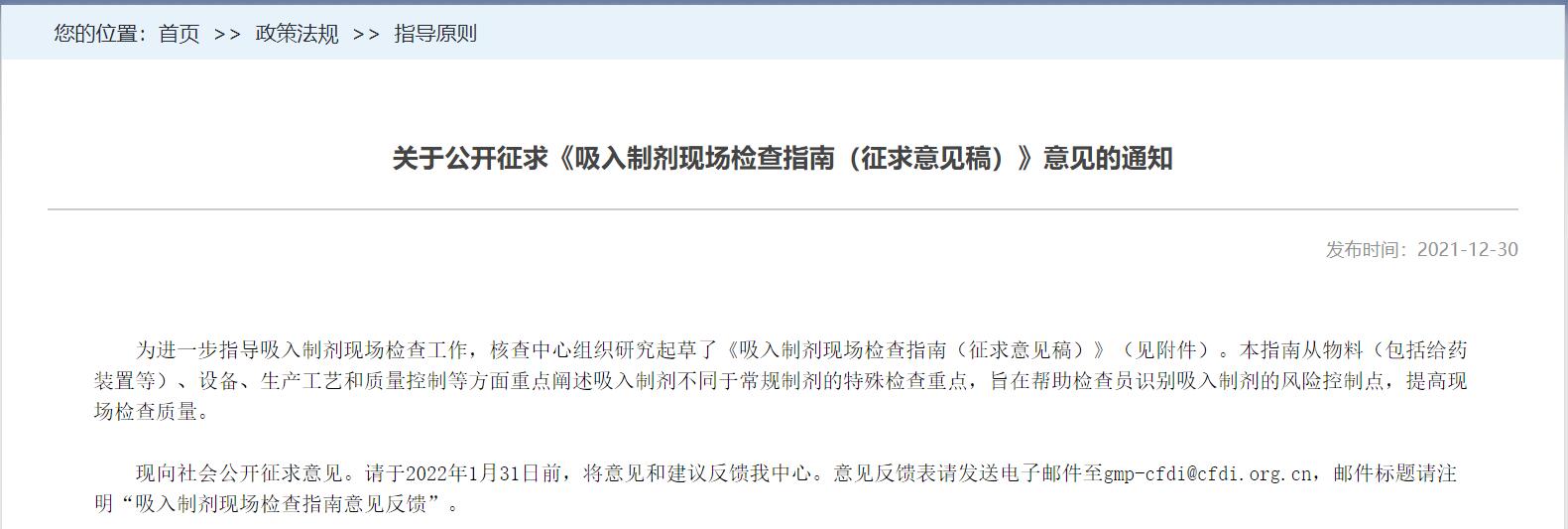 關于公開征求《吸入制劑現場檢查指南(征求意見稿)》意見的通知
