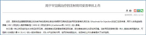 2021年,CDE發(fā)布兩則關(guān)于罕見(jiàn)病用藥的臨床研發(fā)指導(dǎo)原則,通過(guò)優(yōu)先審評(píng)審批方式批準(zhǔn)2款罕見(jiàn)病用藥,分別為奧法妥木單抗注射液(用于治療成人復(fù)發(fā)型多發(fā)性硬化(RMS)) 和注射用司妥昔單抗(用于人體免疫缺陷病毒(HIV)陰性和人皰疹病毒8型(HHV-8)陰性的多中心Castleman?。∕CD)成人患者)。