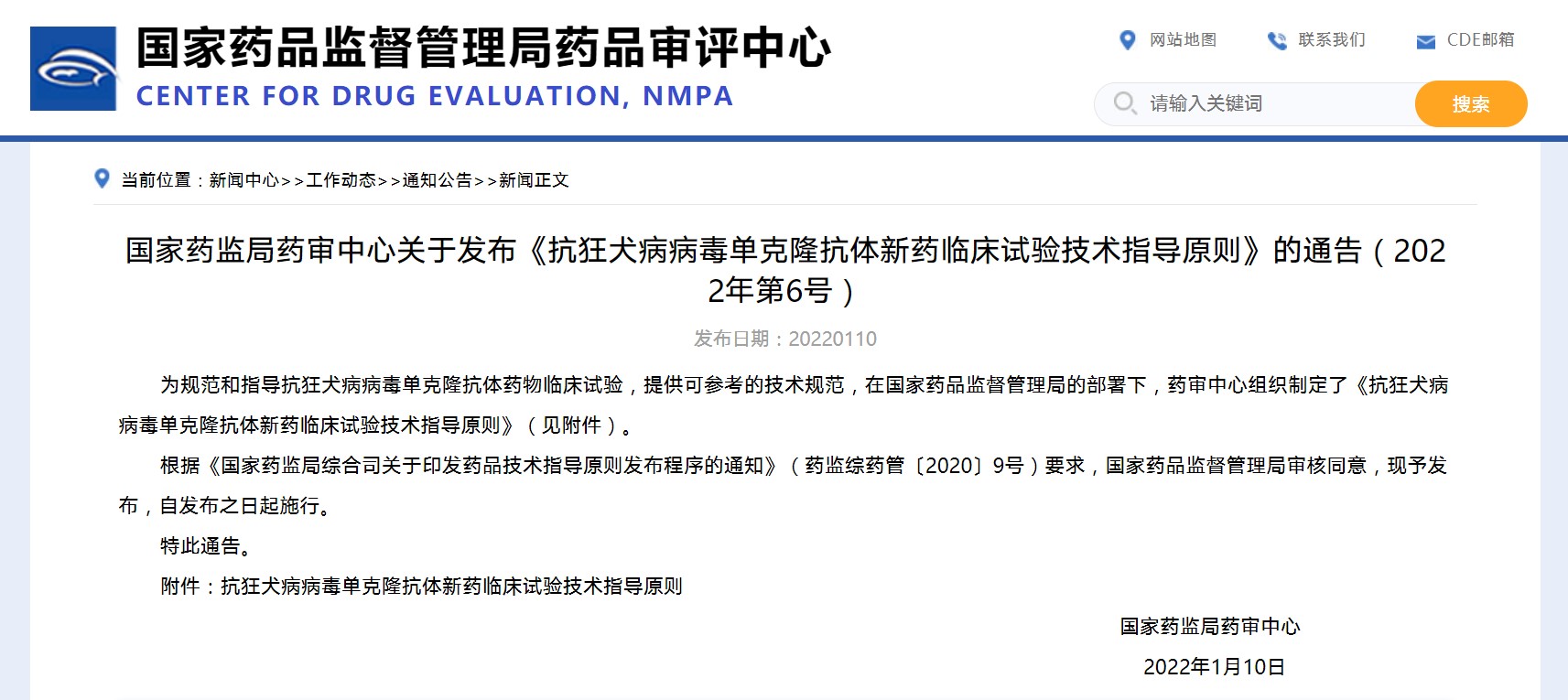 國(guó)家藥監(jiān)局藥審中心關(guān)于發(fā)布《抗狂犬病病毒單克隆抗體新藥臨床試驗(yàn)技術(shù)指導(dǎo)原則》的通告(2022年第6號(hào))