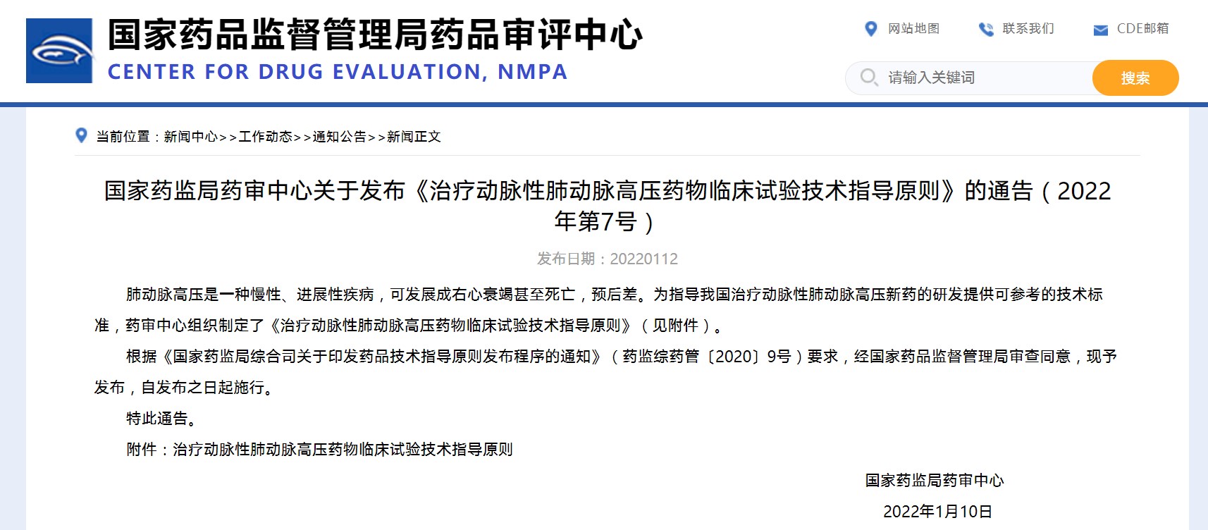 國(guó)家藥監(jiān)局藥審中心關(guān)于發(fā)布《治療動(dòng)脈性肺動(dòng)脈高壓藥物臨床試驗(yàn)技術(shù)指導(dǎo)原則》的通告(2022年第7號(hào))