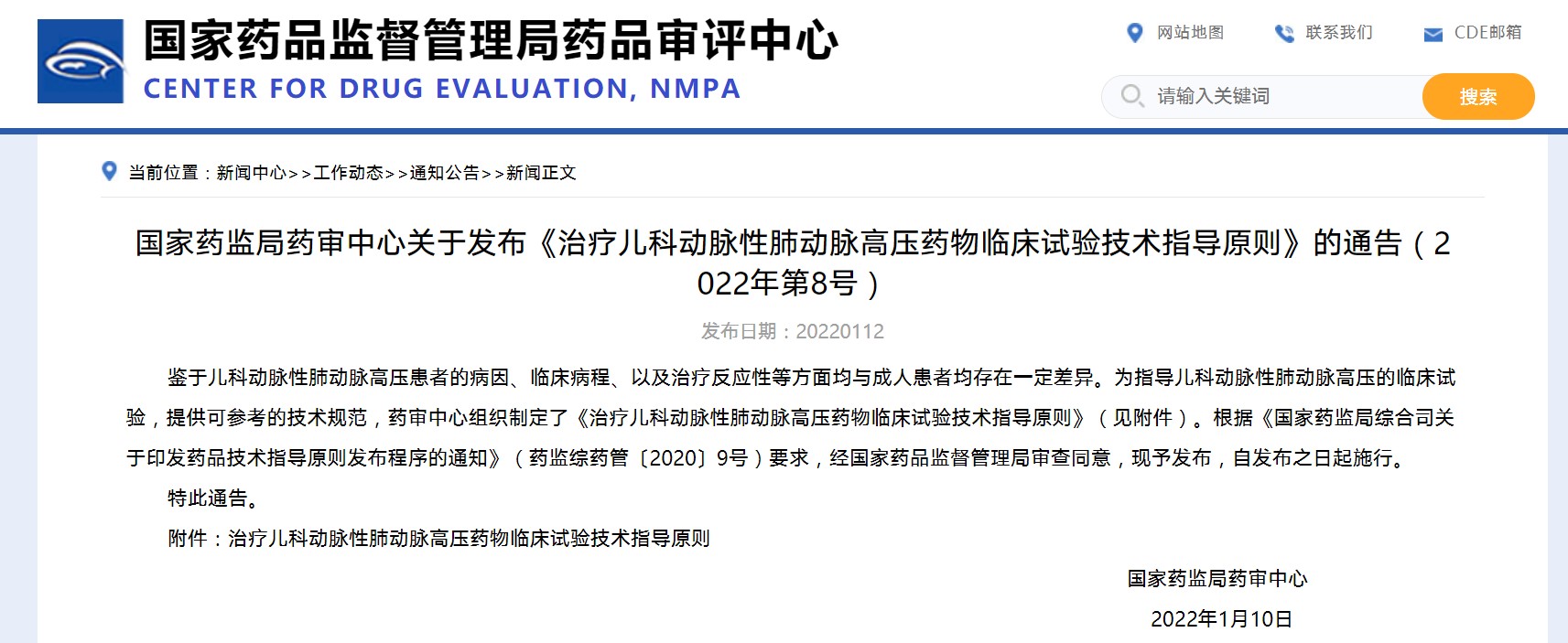 國(guó)家藥監(jiān)局藥審中心關(guān)于發(fā)布《治療兒科動(dòng)脈性肺動(dòng)脈高壓藥物臨床試驗(yàn)技術(shù)指導(dǎo)原則》的通告(2022年第8號(hào))