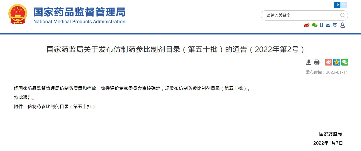 國(guó)家藥監(jiān)局關(guān)于發(fā)布仿制藥參比制劑目錄(第五十批)的通告(2022年第2號(hào))