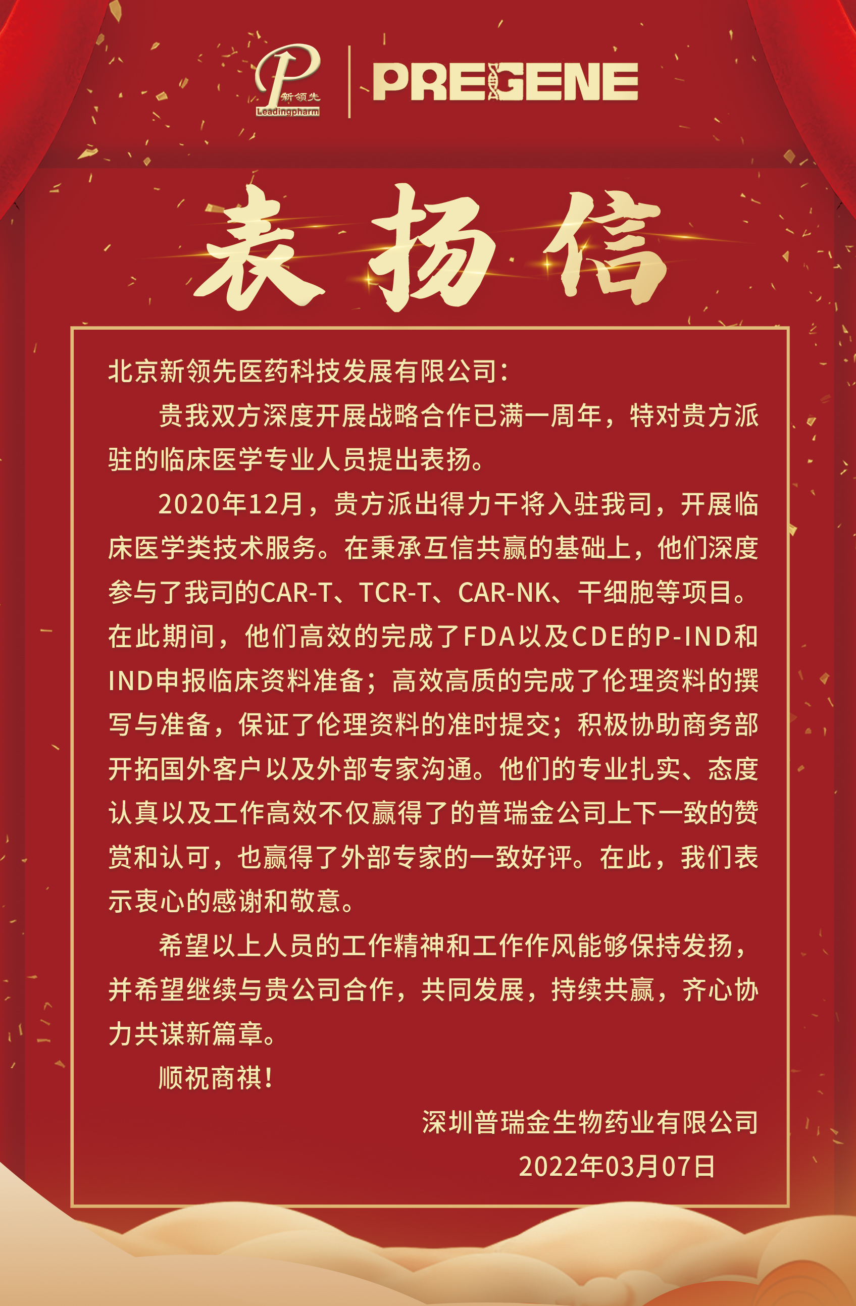 來(lái)自深圳普瑞金的合作表?yè)P(yáng)信