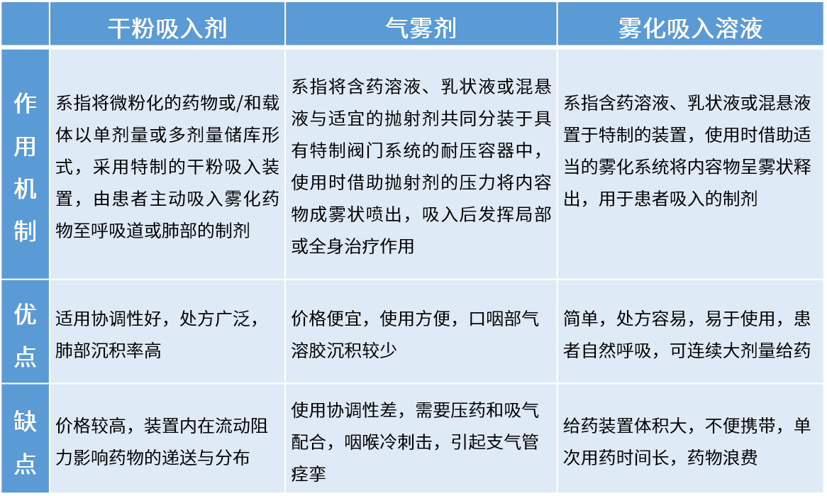 與傳統(tǒng)劑型不同,大多數(shù)經(jīng)口吸入制劑被設(shè)計為局部作用于肺部,主要有霧化吸入劑(nebulizer,也稱噴霧劑)、壓力定量吸入劑(pMDI,也稱氣霧劑) 和干粉吸入劑(DPI,也稱吸入粉霧劑) ,針對其作用機制及優(yōu)缺點見下表。
