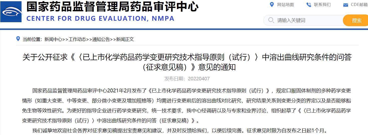 關(guān)于公開征求《〈已上市化學(xué)藥品藥學(xué)變更研究技術(shù)指導(dǎo)原則(試行)〉中溶出曲線研究條件的問答(征求意見稿)》意見的通知