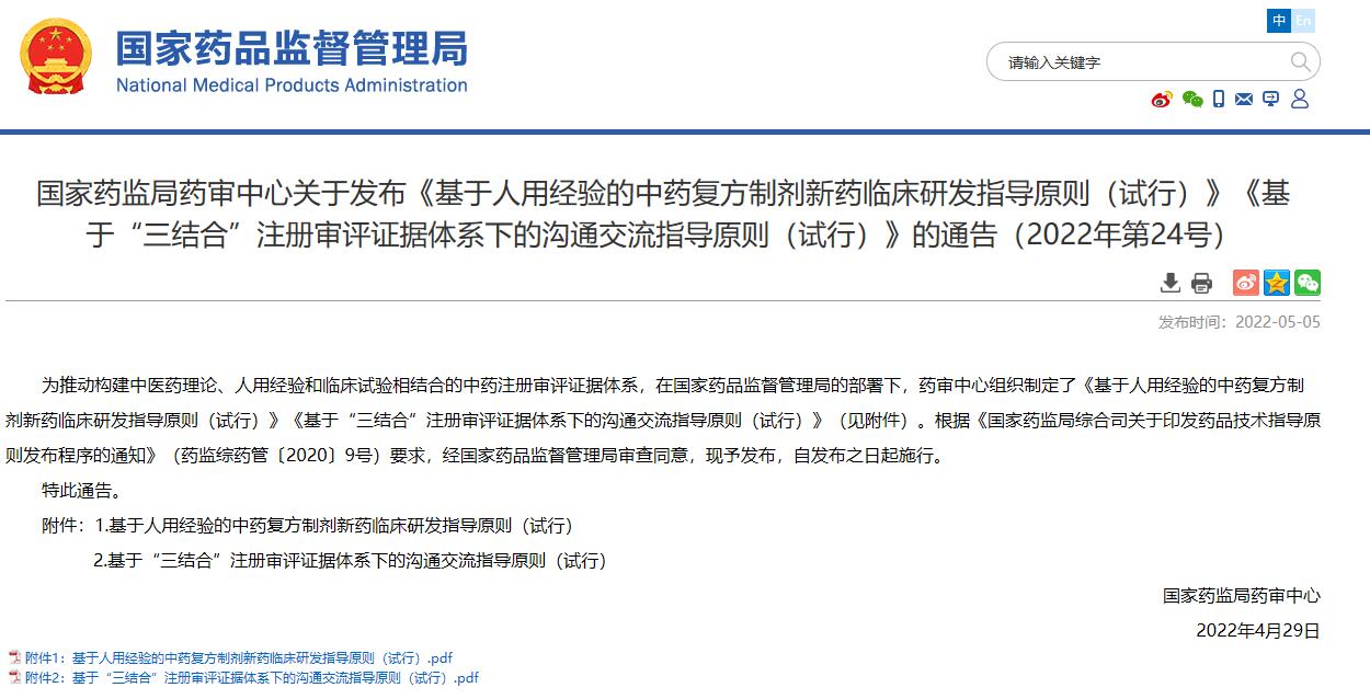 國(guó)家藥品監(jiān)督管理局為推動(dòng)構(gòu)建中醫(yī)藥理論、人用經(jīng)驗(yàn)和臨床試驗(yàn)相結(jié)合的中藥注冊(cè)審評(píng)證據(jù)體系,在國(guó)家藥品監(jiān)督管理局的部署下,藥審中心組織制定了《基于人用經(jīng)驗(yàn)的中藥復(fù)方制劑新藥臨床研發(fā)指導(dǎo)原則(試行)》《基于“三結(jié)合”注冊(cè)審評(píng)證據(jù)體系下的溝通交流指導(dǎo)原則(試行)》。