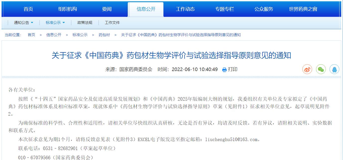 關(guān)于征求《中國藥典》藥包材生物學(xué)評價(jià)與試驗(yàn)選擇指導(dǎo)原則意見的通知