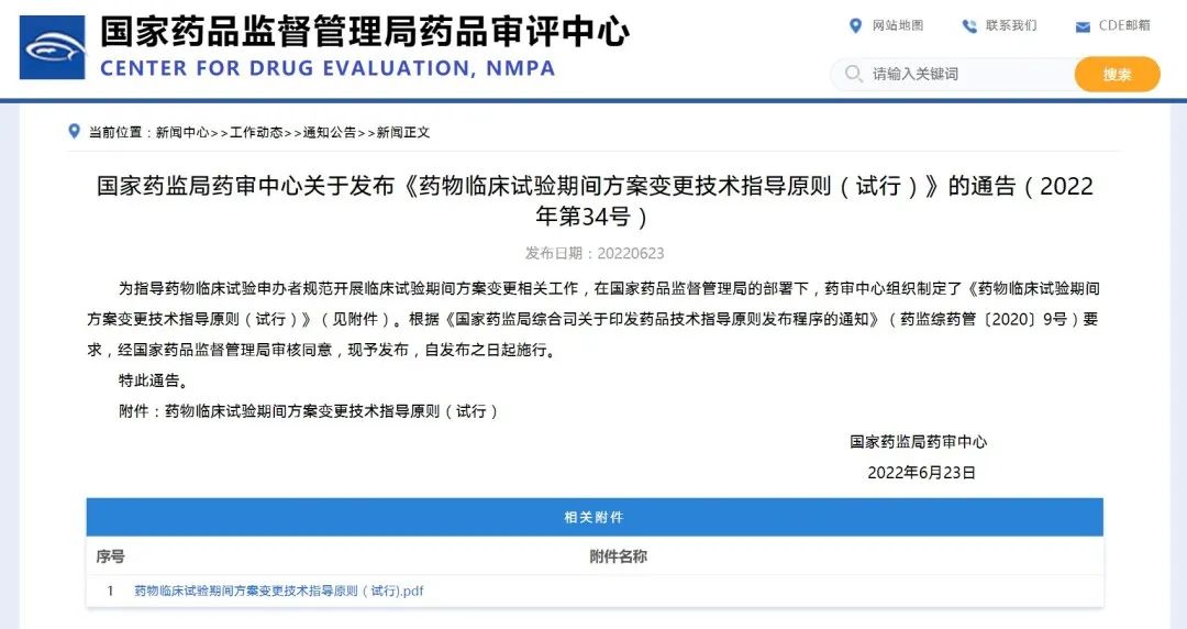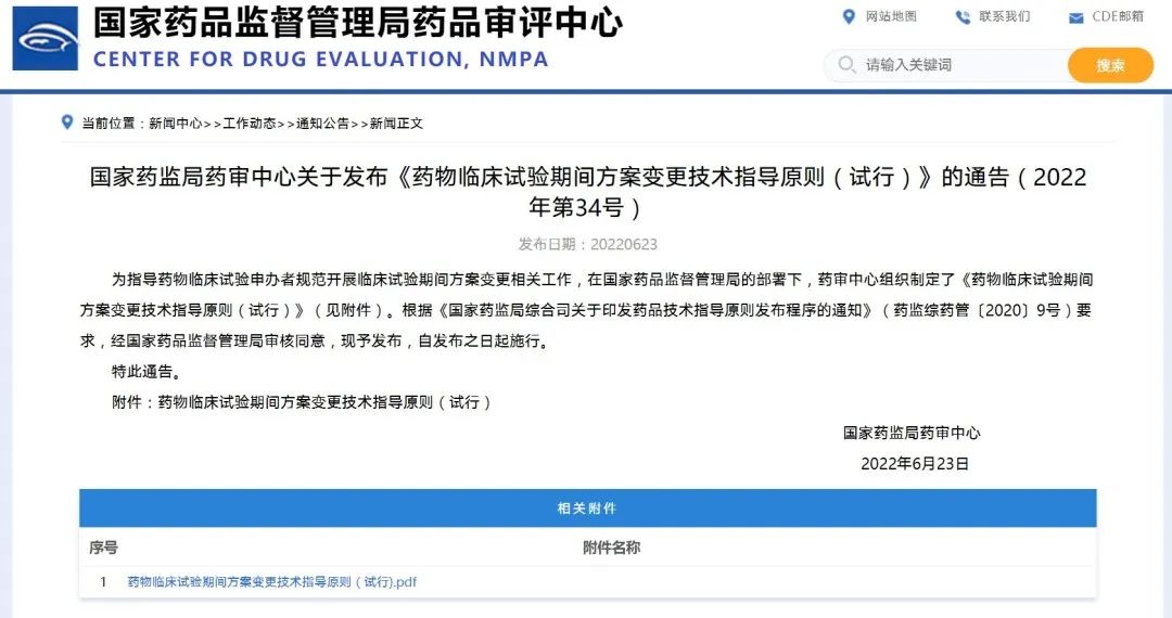 國家藥監(jiān)局藥審中心關(guān)于發(fā)布《藥物臨床試驗期間方案變更技術(shù)指導(dǎo)原則(試行)》的通告(2022年第34號)