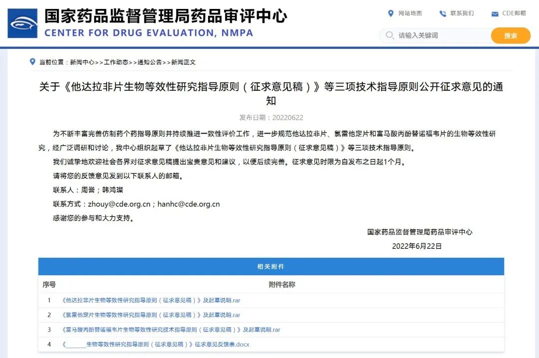 關(guān)于《他達(dá)拉非片生物等效性研究指導(dǎo)原則(征求意見稿)》等三項技術(shù)指導(dǎo)原則公開征求意見的通知