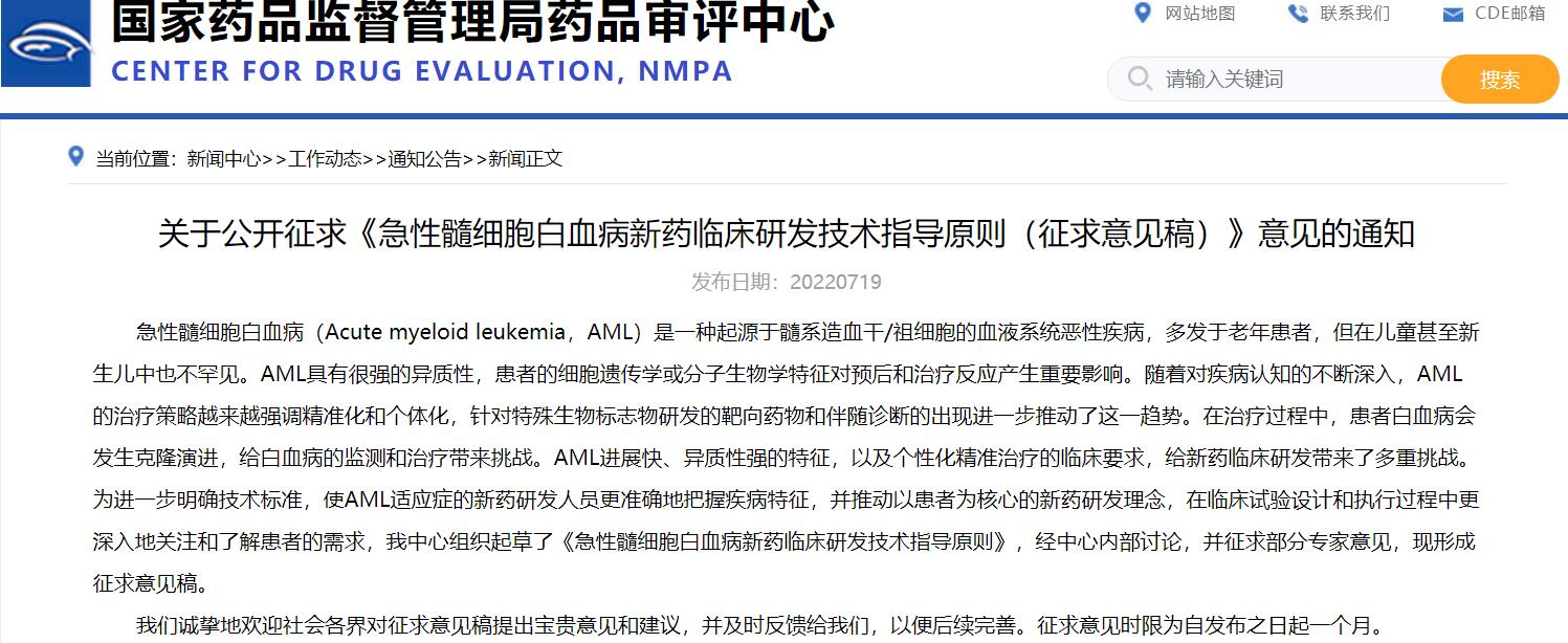關(guān)于公開征求《急性髓細(xì)胞白血病新藥臨床研發(fā)技術(shù)指導(dǎo)原則(征求意見稿)》意見的通知