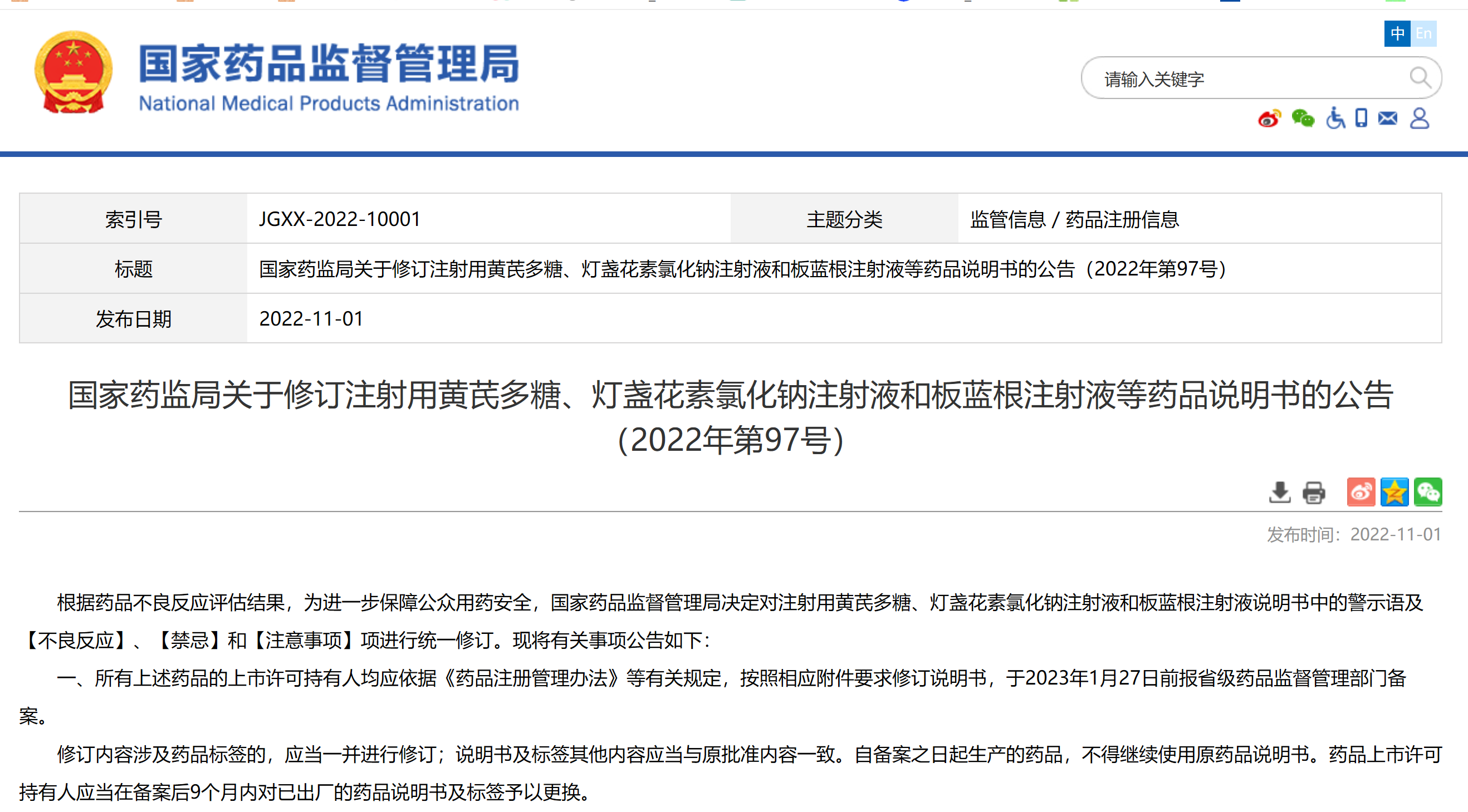 國家藥監(jiān)局關(guān)于修訂注射用黃芪多糖、燈盞花素氯化鈉注射液和板藍根注射液等藥品說明書的公告(2022年第97號)