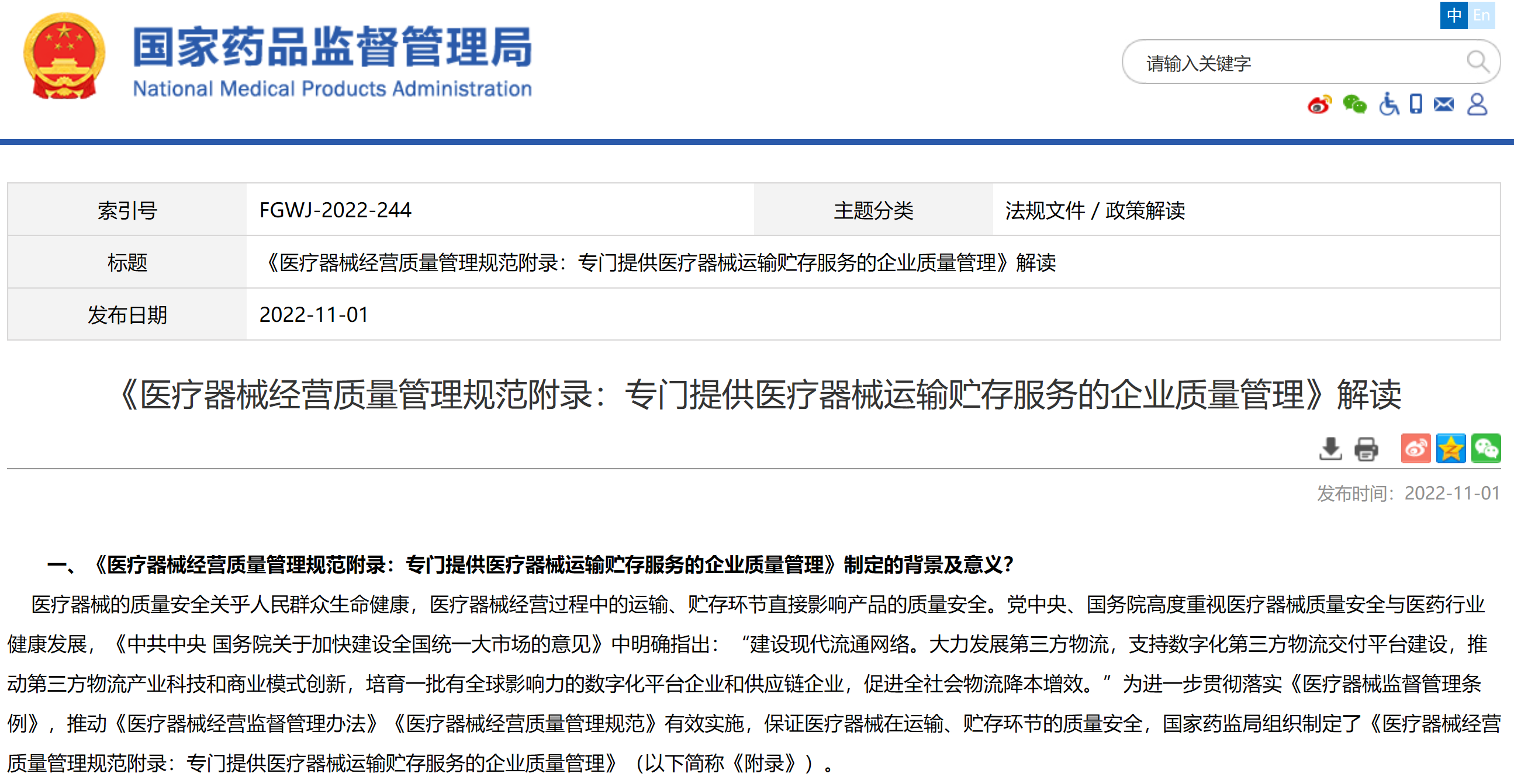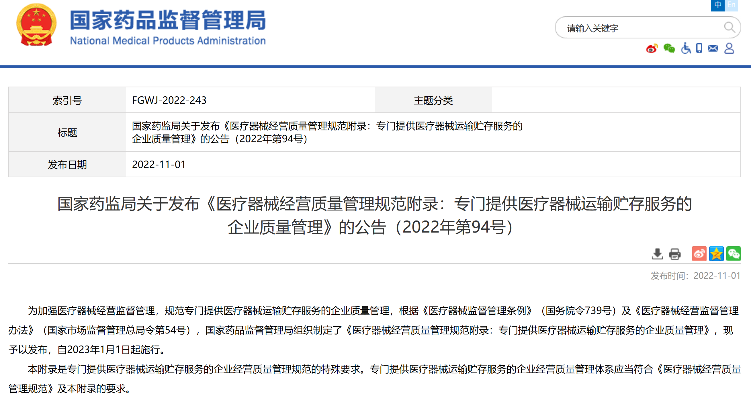 國家藥監(jiān)局關(guān)于發(fā)布《醫(yī)療器械經(jīng)營質(zhì)量管理規(guī)范附錄:專門提供醫(yī)療器械運輸貯存服務(wù)的企業(yè)質(zhì)量管理》的公告(2022年第94號)