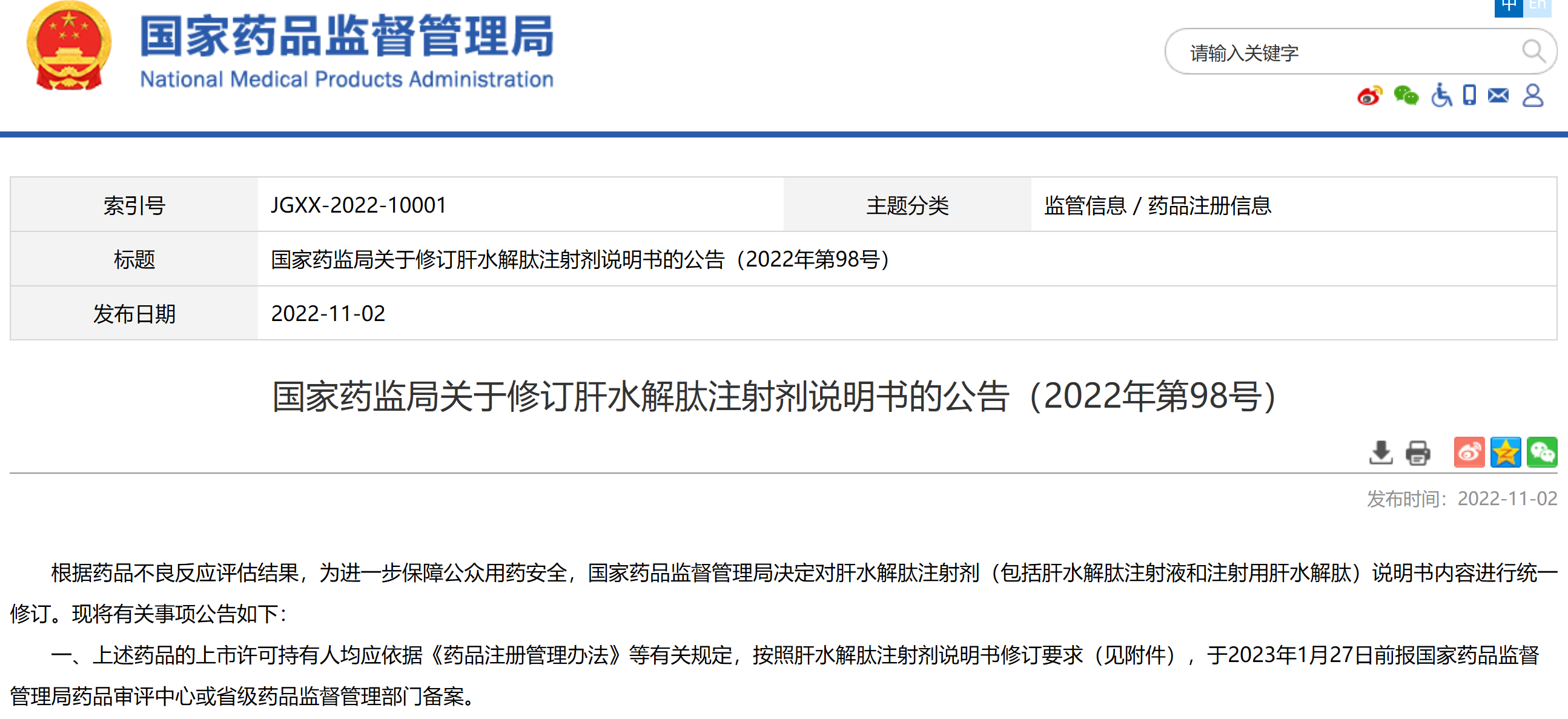 國家藥監(jiān)局關(guān)于修訂肝水解肽注射劑說明書的公告(2022年第98號)