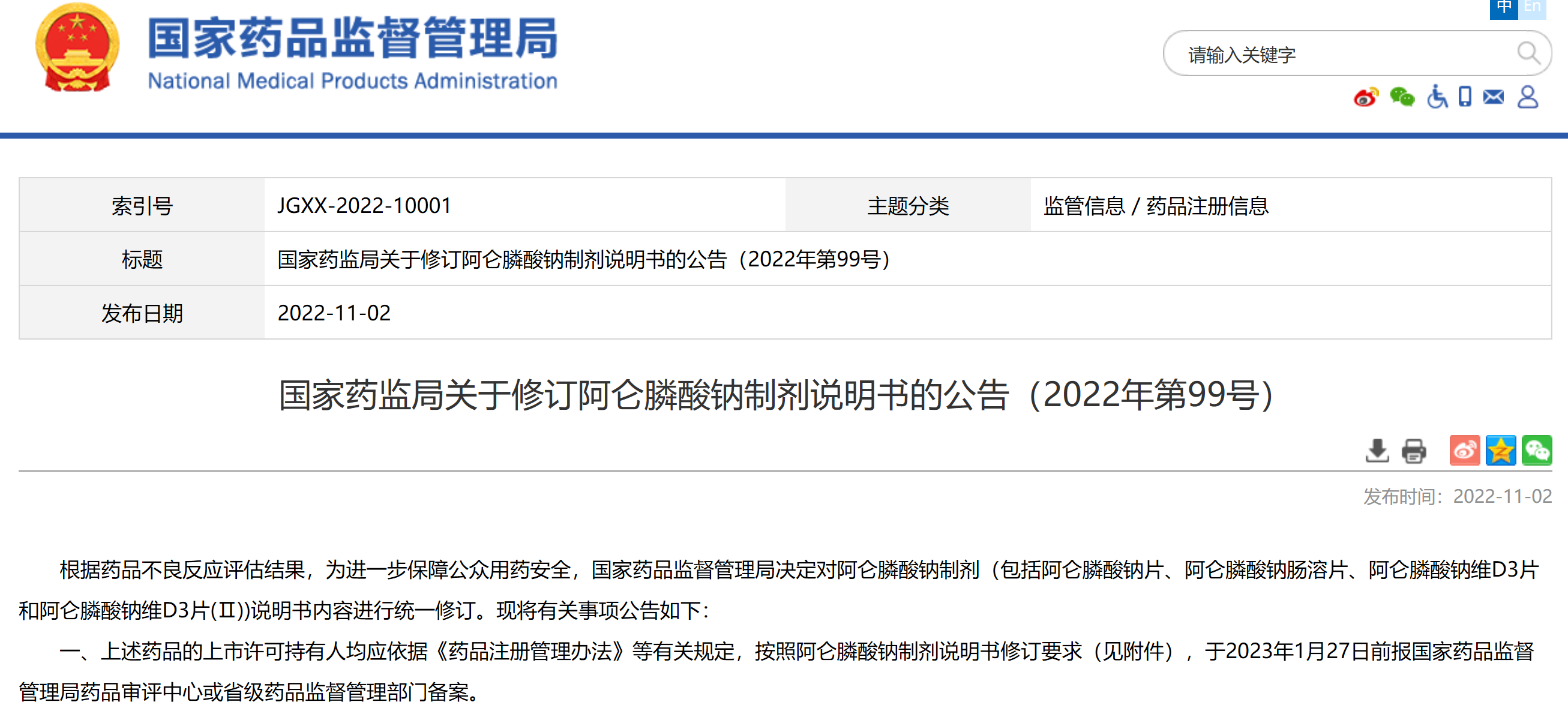國家藥監(jiān)局關(guān)于修訂阿侖膦酸鈉制劑說明書的公告(2022年第99號)