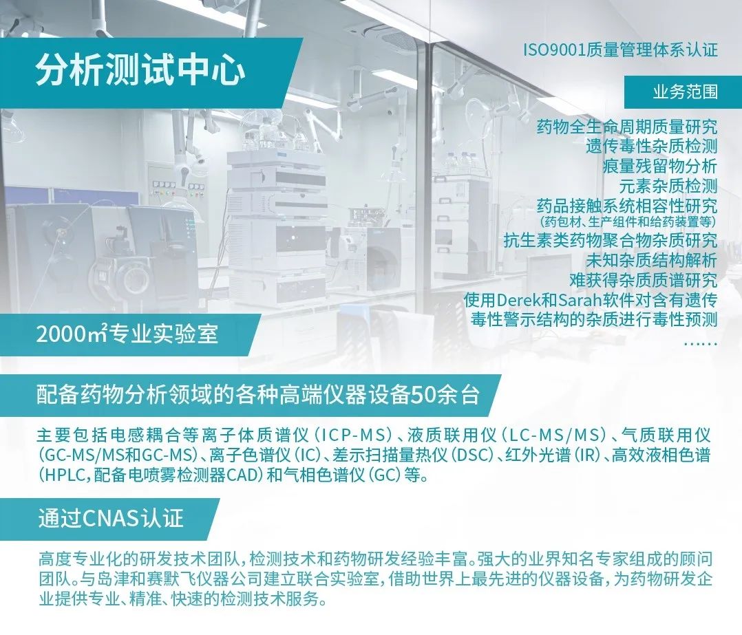 分析測試中心自2014年起獨立開展藥品研發(fā)工作,積累了豐富的藥物質(zhì)量研究經(jīng)驗,主要提供痕量物質(zhì),如遺傳毒性雜質(zhì)、元素雜質(zhì)、殘留溶劑、聚合物雜質(zhì)、復(fù)雜制劑輔料剖析、藥品接觸系統(tǒng)相容性研究等符合NMPA、FDA、EMA等法規(guī)要求的研究檢測服務(wù)。