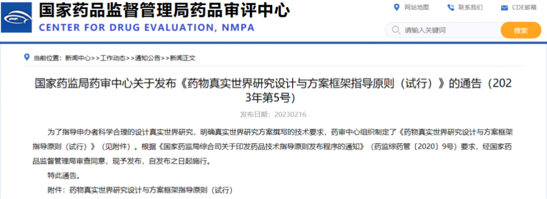 國家藥監(jiān)局藥審中心關于發(fā)布《藥物真實世界研究設計與方案框架指導原則(試行)》的通告(2023年第5號)