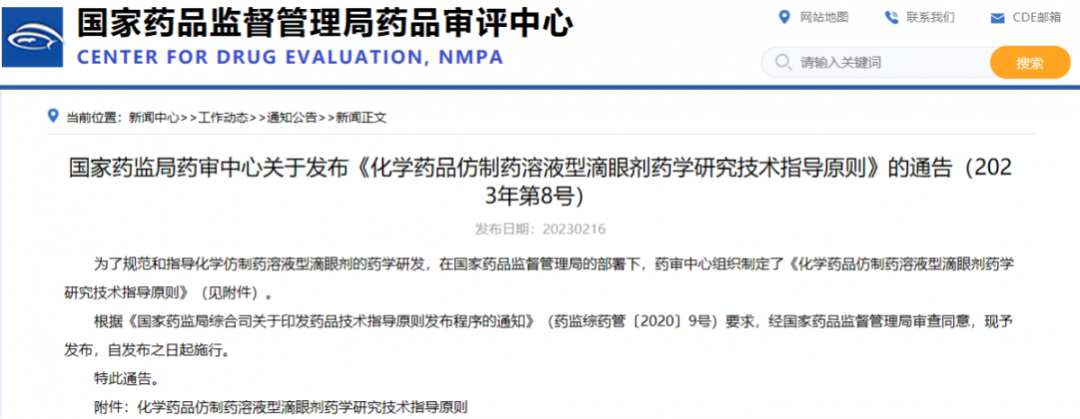國家藥監(jiān)局藥審中心關于發(fā)布《化學藥品仿制藥溶液型滴眼劑藥學研究技術(shù)指導原則》的通告(2023年第8號)