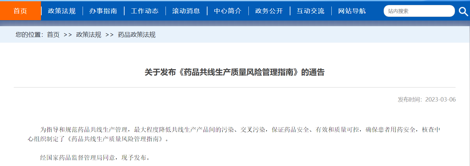 國(guó)家藥監(jiān)局核查中心關(guān)于發(fā)布《藥品共線生產(chǎn)質(zhì)量風(fēng)險(xiǎn)管理指南》的通告