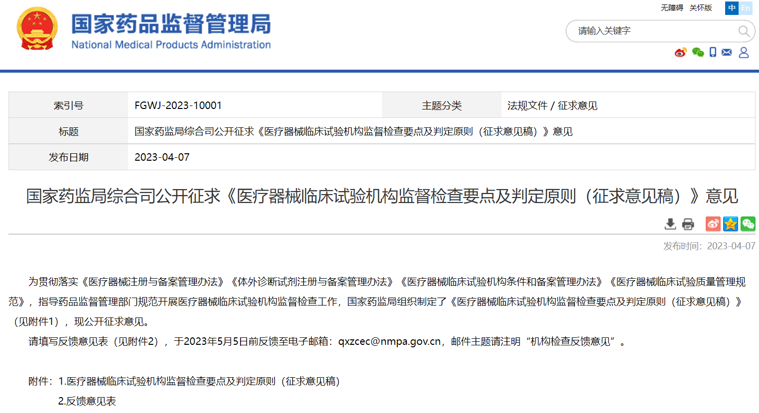 國家藥監(jiān)局綜合司公開征求《醫(yī)療器械臨床試驗(yàn)機(jī)構(gòu)監(jiān)督檢查要點(diǎn)及判定原則(征求意見稿)》意見