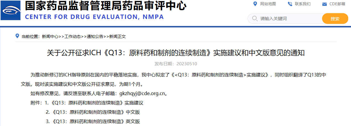 關于公開征求ICH《Q13:原料藥和制劑的連續(xù)制造》實施建議和中文版意見的通知