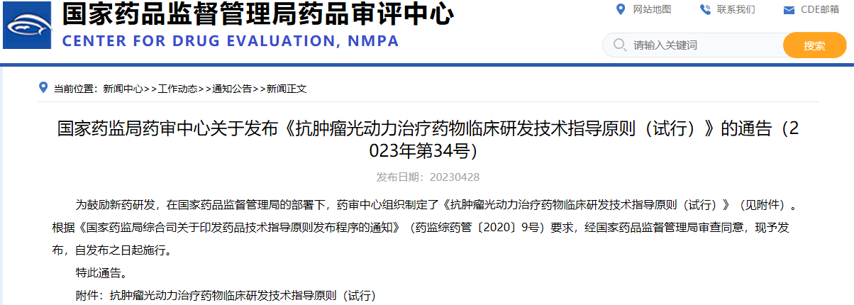 國家藥監(jiān)局藥審中心關于發(fā)布《抗腫瘤光動力治療藥物臨床研發(fā)技術指導原則(試行)》的通告(2023年第34號)