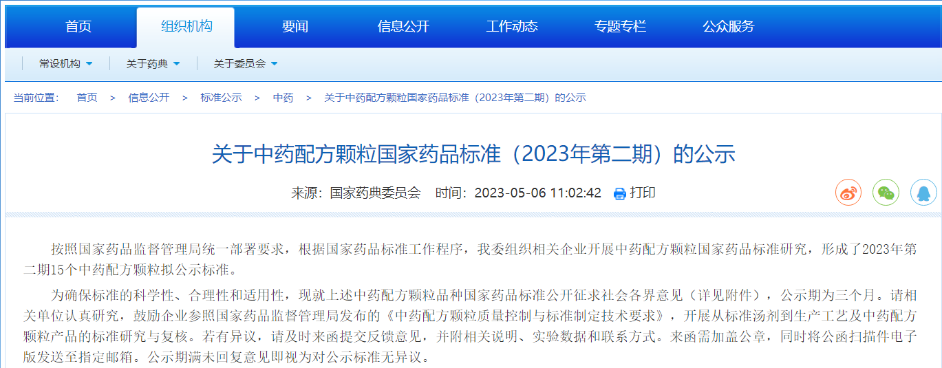 國家藥典委關于中藥配方顆粒國家藥品標準(2023年第二期)的公示
