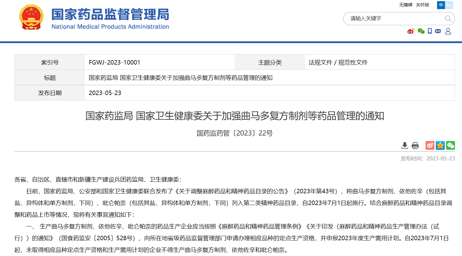 國家藥監(jiān)局 國家衛(wèi)生健康委關(guān)于加強(qiáng)曲馬多復(fù)方制劑等藥品管理的通知