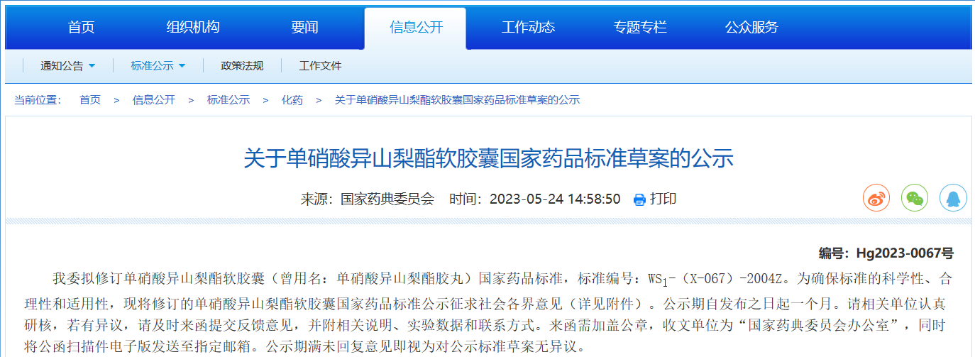 本周藥典委發(fā)布關(guān)于單硝酸異山梨酯軟膠囊國家藥品標(biāo)準(zhǔn)草案的公示。