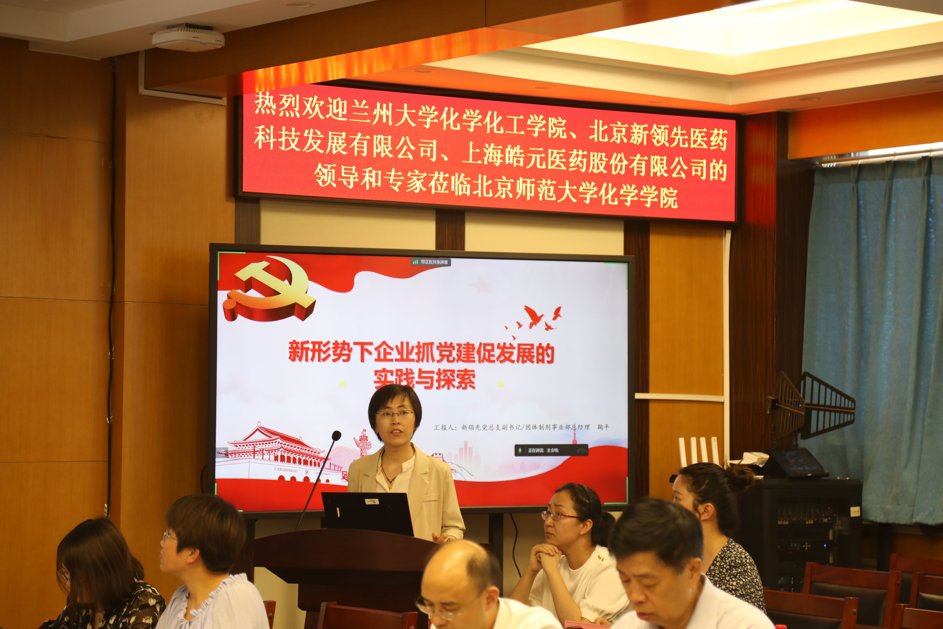 參加本次研討活動的有:北京師范大學化學學院黨委書記盧忠林教授,化學學院院長毛蘭群教授,化學學院黨委副書記韓娟博士,科研院校地合作與科研成果轉化處副處長孫根班教授;蘭州大學化學化工學院黨委書記杜生一博士,功能有機分子化學國家重點實驗室主任王為教授(線上);新領先醫(yī)藥黨總支書記、董事長陶新華先生,副總裁顏耀東先生、張翔先生,黨總支副書記、固體制劑事業(yè)部總經理鞠平女士,黨總支紀支檢委員、臨床運營部副總監(jiān)杜書青女士;上海皓元產品負責人、樂研首席科學家陳委先生等30余人。