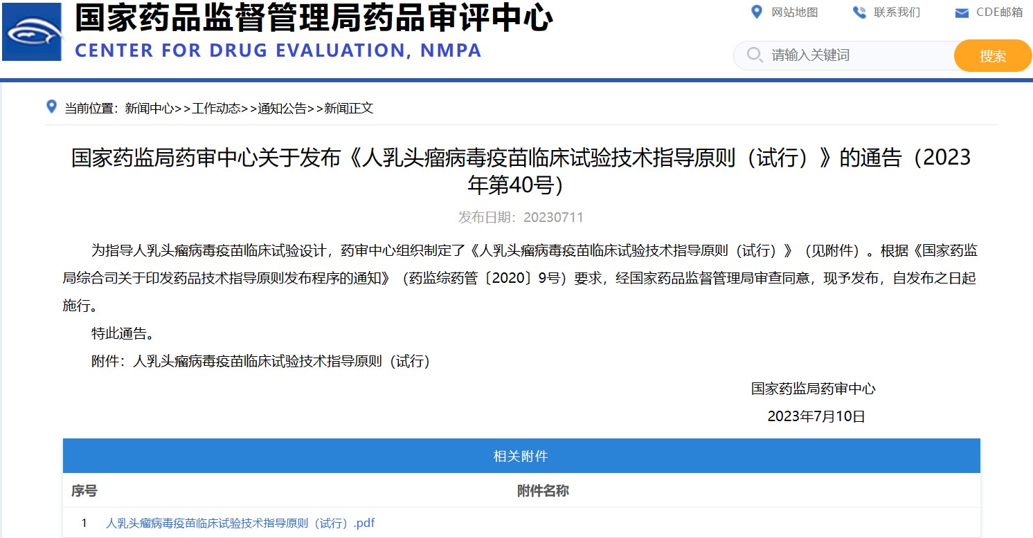 國家藥監(jiān)局藥審中心關(guān)于發(fā)布《人乳頭瘤病毒疫苗臨床試驗(yàn)技術(shù)指導(dǎo)原則(試行)》的通告(2023年第40號(hào))