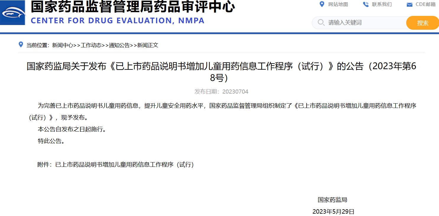 國家藥監(jiān)局關(guān)于發(fā)布《已上市藥品說明書增加兒童用藥信息工作程序(試行)》的公告(2023年第68號(hào))