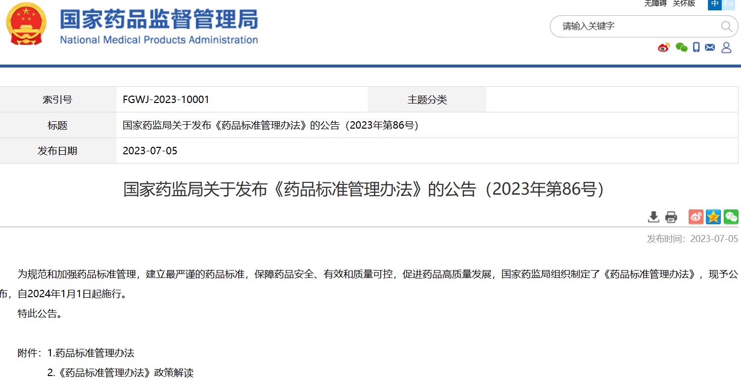 國家藥監(jiān)局關(guān)于發(fā)布《藥品標(biāo)準(zhǔn)管理辦法》的公告(2023年第86號(hào))