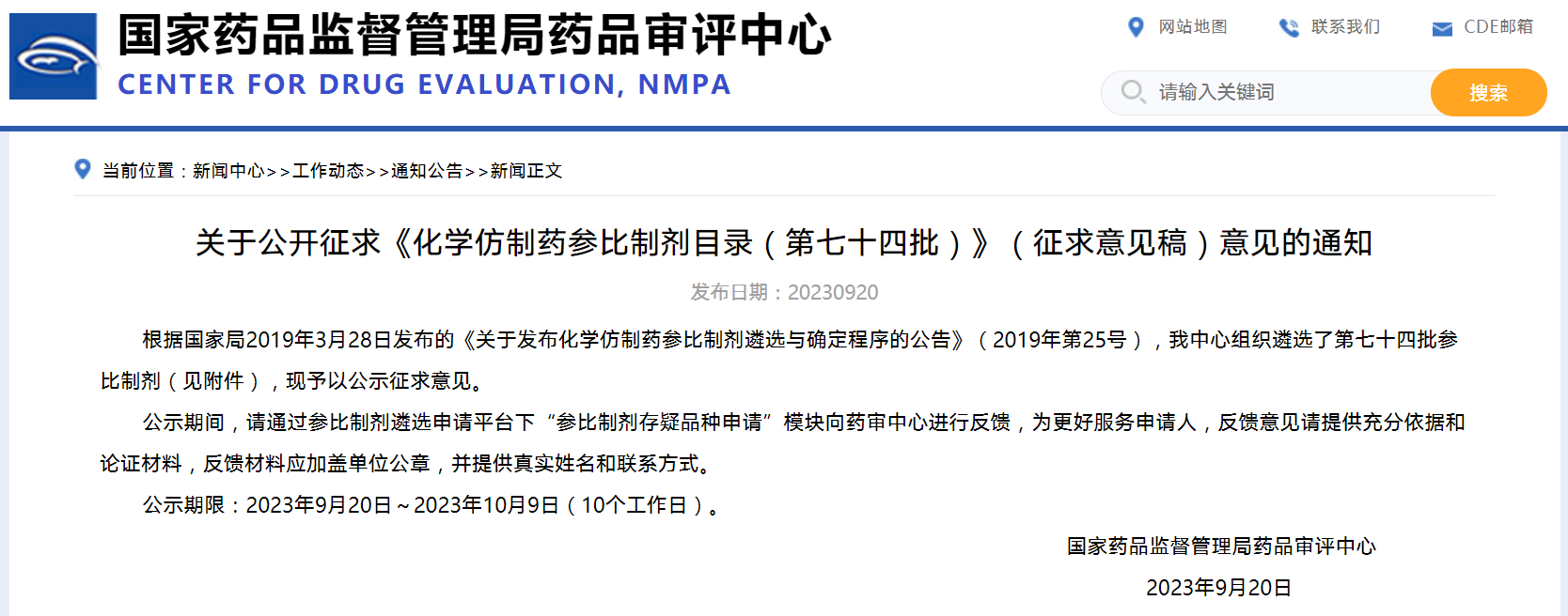 關(guān)于公開征求《化學(xué)仿制藥參比制劑目錄(第七十四批)》(征求意見稿)意見的通知