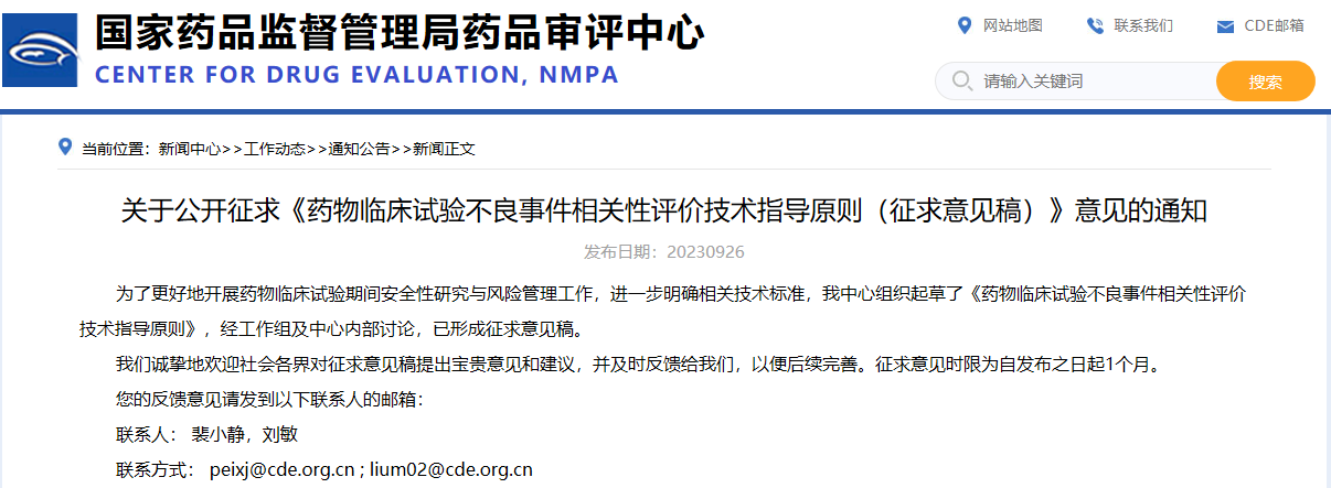 關(guān)于公開征求《藥物臨床試驗不良事件相關(guān)性評價技術(shù)指導原則(征求意見稿)》意見的通知