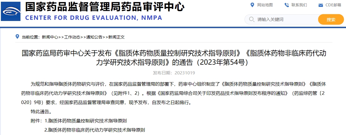國(guó)家藥監(jiān)局藥審中心關(guān)于發(fā)布《脂質(zhì)體藥物質(zhì)量控制研究技術(shù)指導(dǎo)原則》《脂質(zhì)體藥物非臨床藥代動(dòng)力學(xué)研究技術(shù)指導(dǎo)原則》的通告(2023年第54號(hào))